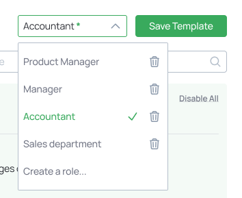 - Create a new role by choosing the corresponding variant from the dropdown list, entering its name, and pressing the Save Template button. Note that the role will be created immediately with the set of permissions that are already assigned to this admin, so you need to first assign all permissions, then create a new role.