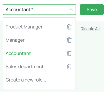 - Roles can be deleted by pressing the "Trash can" icon in the dropdown list.
