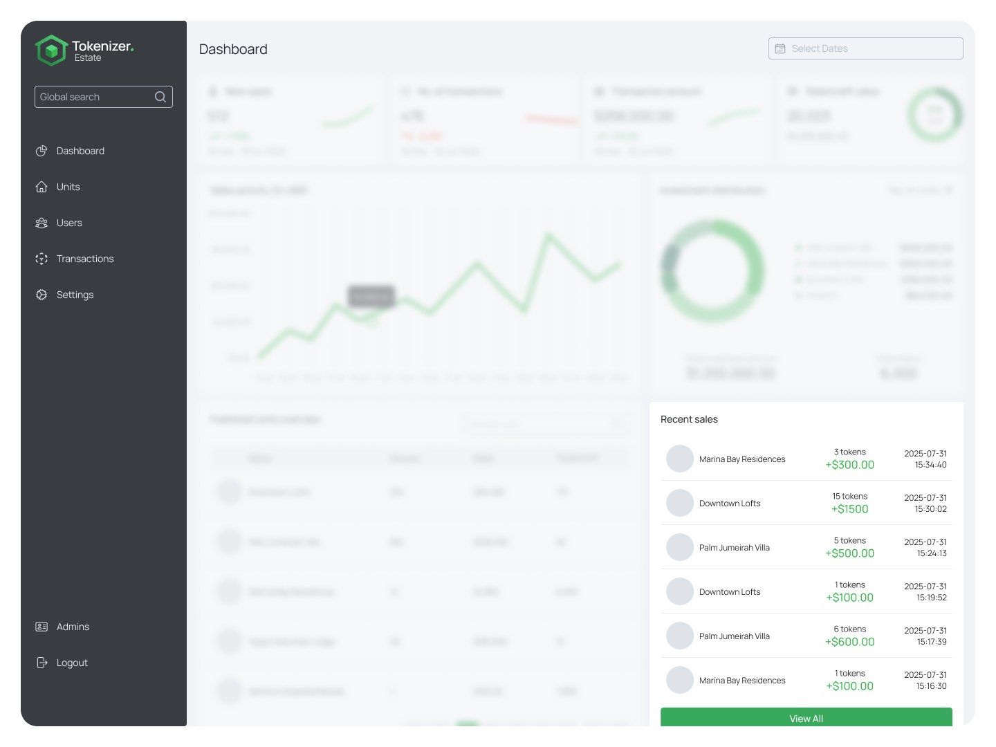 - Investment Distribution Chart – A donut chart showing the proportional allocation of tokenized assets across published units. Hover over each section to see the investment amount per unit.